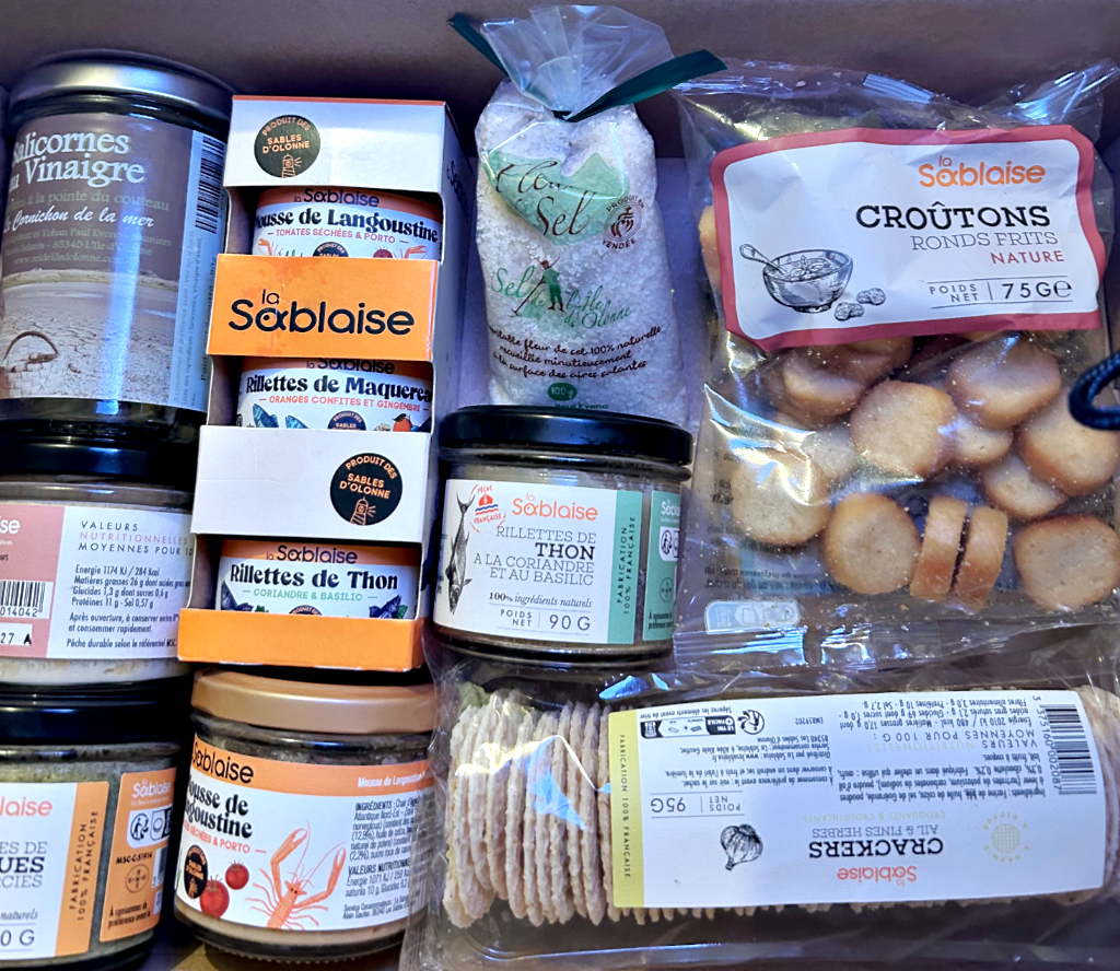 Une sélection authentique de produits de la mer vendéenne : rillettes, mousses, crackers, sel et spécialités locales.